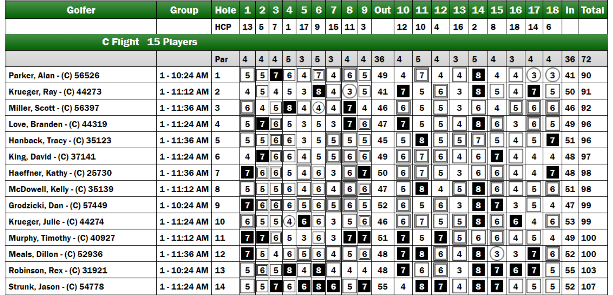 Following the first day of competition, Tracy Hanback and Scott Miller were tied for the lead in the C Flight, both posting scores of 88. Kathy Haeffner closely followed with a score of 89, while Dillon Meal recorded a 90. On the second day, Alan Parker distinguished himself by achieving birdies on both holes 17 and 18, culminating in the lowest round of the day for the C flight and establishing a clubhouse score of +39. Ultimately, only Miller surpassed Parker, finishing at +36 and securing his first Tour victory along with a prize of $500. Parker took second place, earning $300, while Hanback received $200 for third. Notably, Ray Krueger made a remarkable ascent on the leaderboard, moving from a tie for last place after day one to seventh position. Excellent round, Ray!