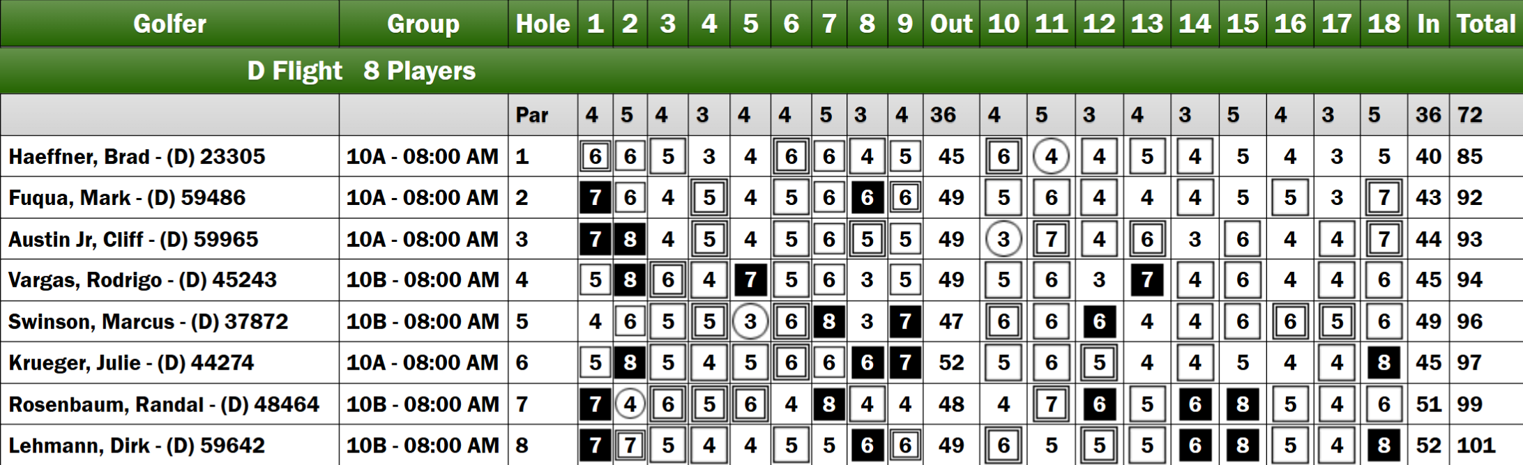 The D Flight commenced with Cliff Austin Jr. achieving a birdie on his opening hole. Brad Haeffner followed suit, securing a birdie on the second hole and ultimately leading the front line with a score of 40. He was closely followed by Mark Fuqua, who finished with a score of 43, and Austin Jr., who recorded a 44. Haeffner maintained his lead by scoring a 45 on the back nine, with Fuqua securing second place and Austin Jr. finishing in third.