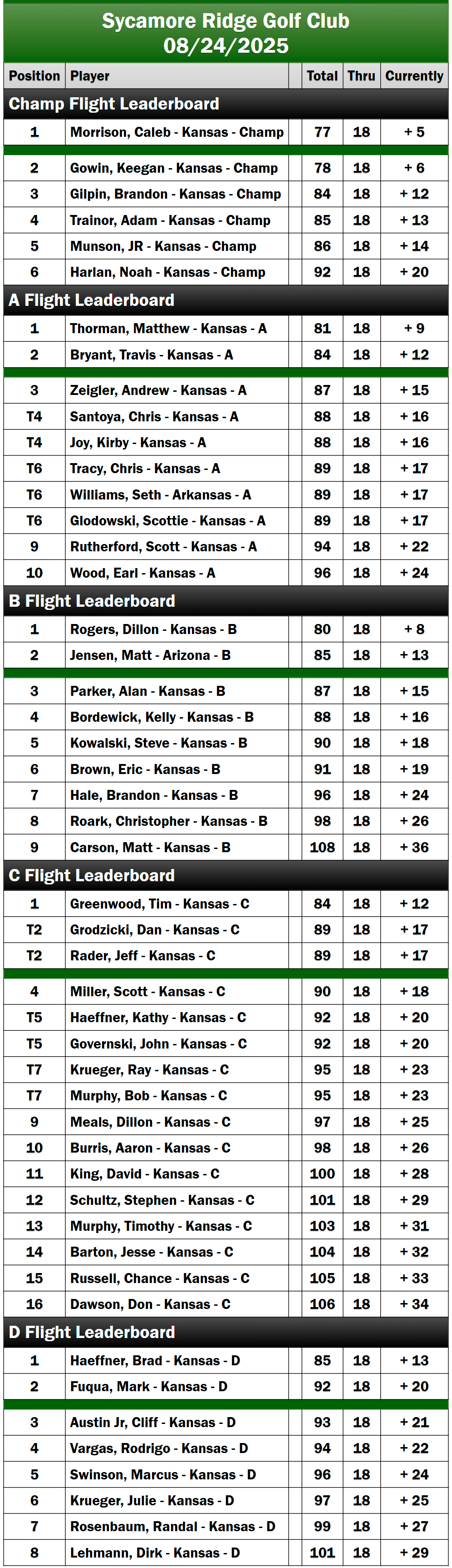 We extend our sincere gratitude to Sycamore Ridge Golf Club and its staff for their invaluable contributions to the success of our event. We would also like to thank our tournament sponsor, Rader Lodge, for their unwavering support of the Kansas Golfweek Amateur Tour.