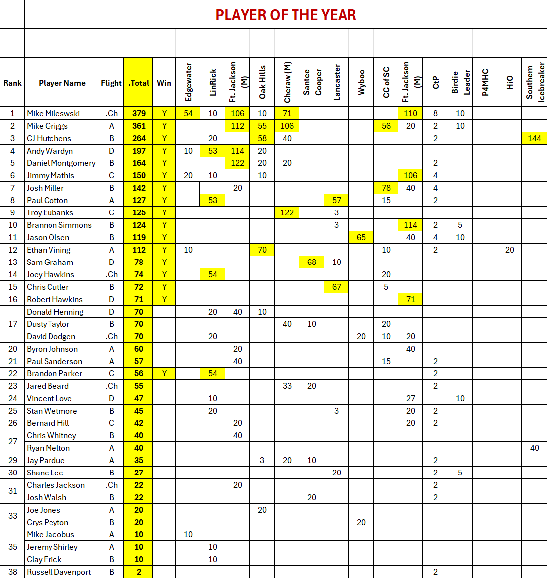 Columbia's new Player of the Year points are here! Points are only gained from events on the GolfWeek Columbia Tour, Combo Events, or Regional Tournaments.