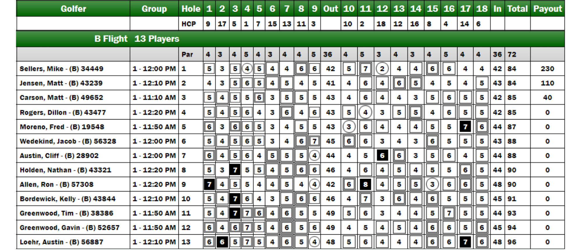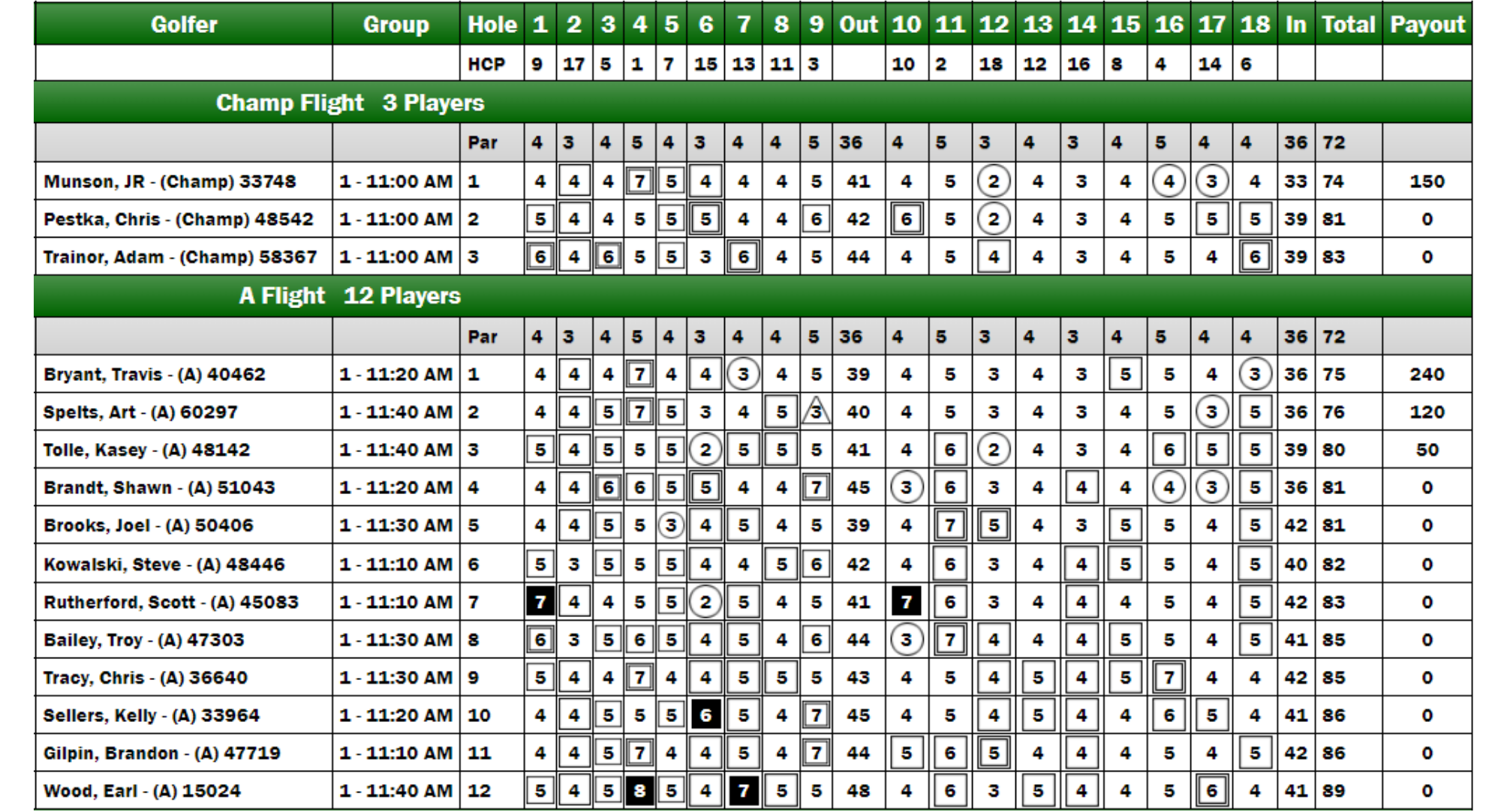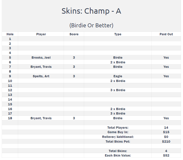 The A Flight featured 12 competitors, with six players positioned within three shots at the turn. Former green jacket winners Travis Bryant and Joel Brooks set the early pace at +3. The 2023 Player of the Year, Scott Rutherford, trailed by two shots, sharing the position with Kasey Tolle. New member Art Spelt made an impressive move by eagling the ninth hole, closing the gap to just one shot at the turn. Shawn Brandt also made a push, reducing the deficit to four shots by starting the back nine with a birdie. As the competition unfolded, Spelt birdied the 17th hole, taking a one-shot lead over Bryant with only the 18th hole remaining. The victory was ultimately secured when Bryant made a birdie, while Spelt's solitary bogey on the back nine proved to be the deciding factor.
