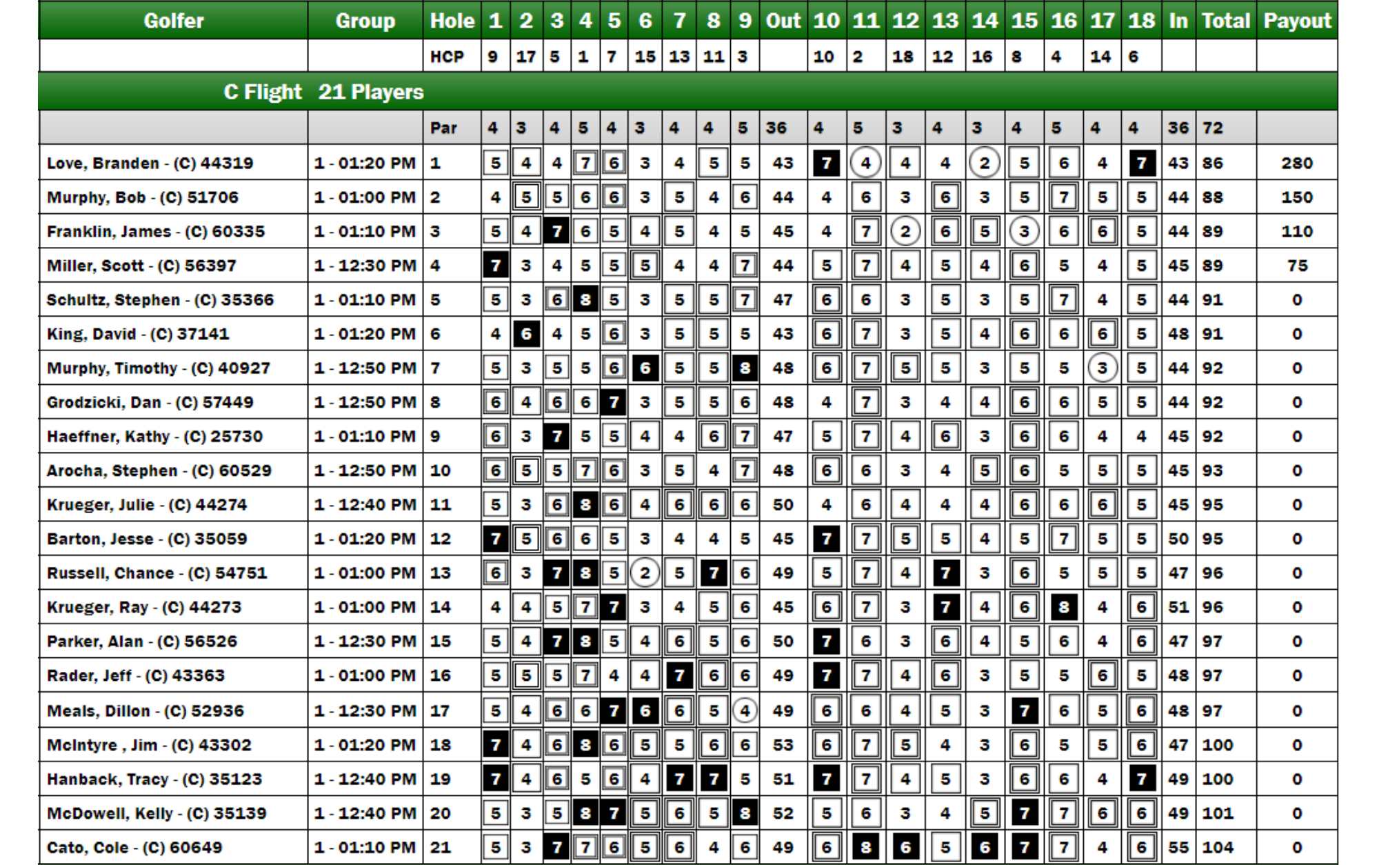 After Love experienced a triple bogey on the 10th hole, he rebounded impressively, securing birdies on the 11th and 14th holes to clinch his first victory of the year, finishing two shots ahead of Bob Murphy. James Franklin and Scott Miller tied for third place. Meanwhile, King faced difficulties on the back nine, ultimately finishing tied for fifth alongside Stephen Schultz, who also claimed the C Flight's long drive title. This leaves seven golfers tied with one win each in the C Flight standings.