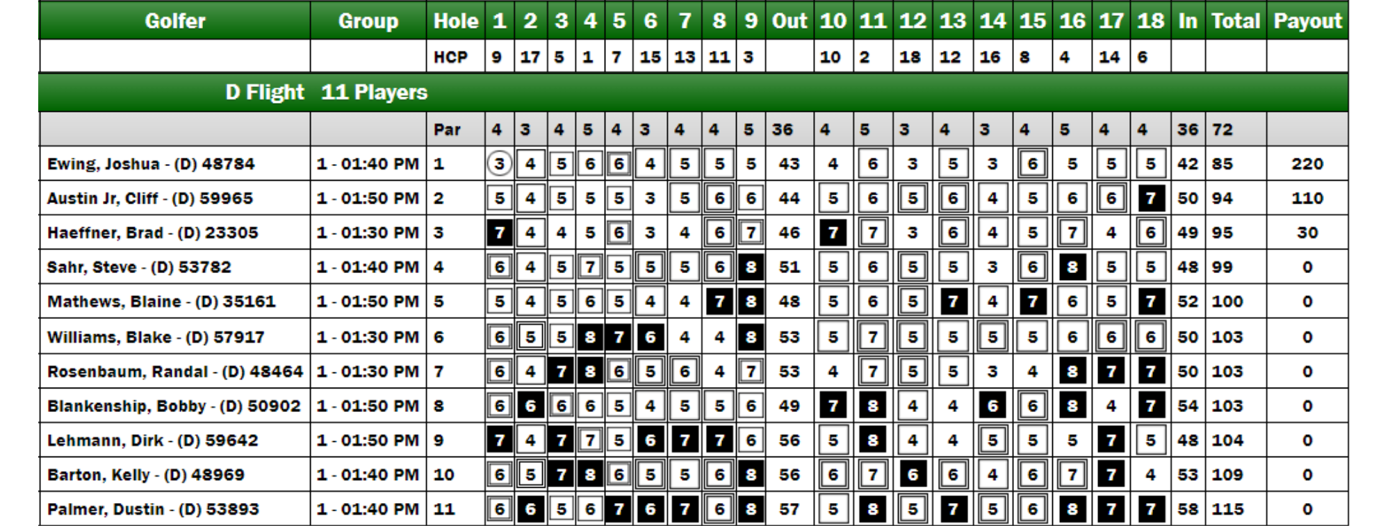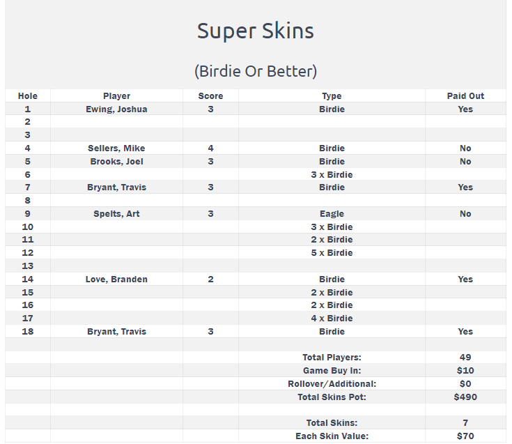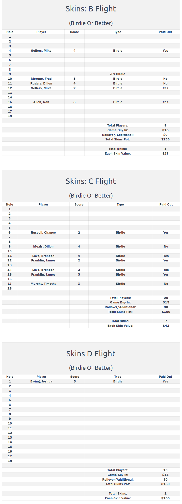 Josh Ewing commenced the D Flight with remarkable performance, securing a birdie that afforded him a one-shot lead over Cliff Austin Jr. at the turn. Meanwhile, Brad Haeffner found himself trailing by three shots after an unfortunate triple bogey at the outset. Ewing sustained his momentum throughout the back nine, ultimately achieving his first victory of the season. Cliff Austin Jr. finished in second place, while Brad Haeffner claimed third, just one stroke behind. Additionally, Ewing distinguished himself by recording the only birdie in the D flight, tied in the Par 3 Challenge, and claimed D Flight long drive, earning over $150 in skins money as a result.