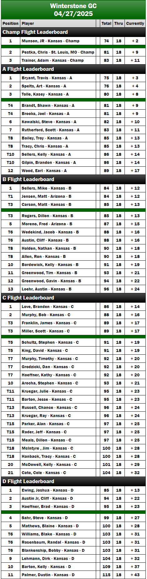 The Championship Flight showcased Player of the Year JR Munson and Adam Trainor, who had previously faced off in a playoff during our last tournament. St. Louis member Chris Pestka made another appearance, initially holding a one-shot lead over Munson after four holes. However, by the turn, Munson had regained his lead by one stroke, with Trainor trailing three shots behind. Munson recorded three birdies on the back nine, finishing with a score of 33, which secured his fourth tournament victory of the season. We encourage all championship players to join us in the challenge to dethrone Munson, who remains undefeated this season with a record of 4 for 4 in tournament wins.