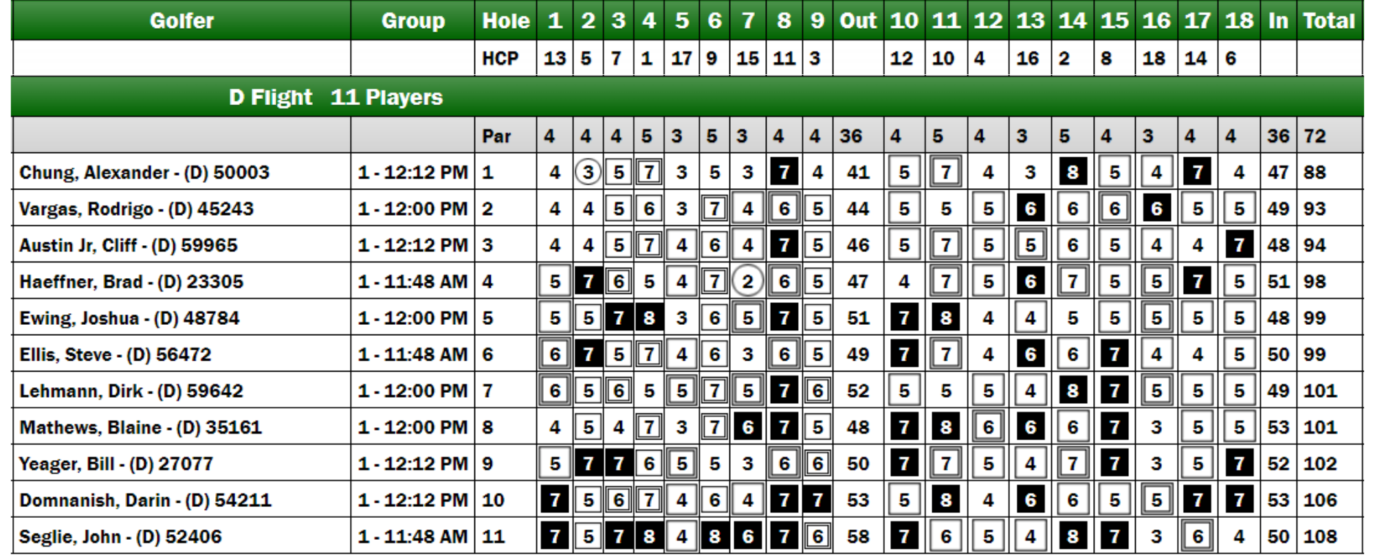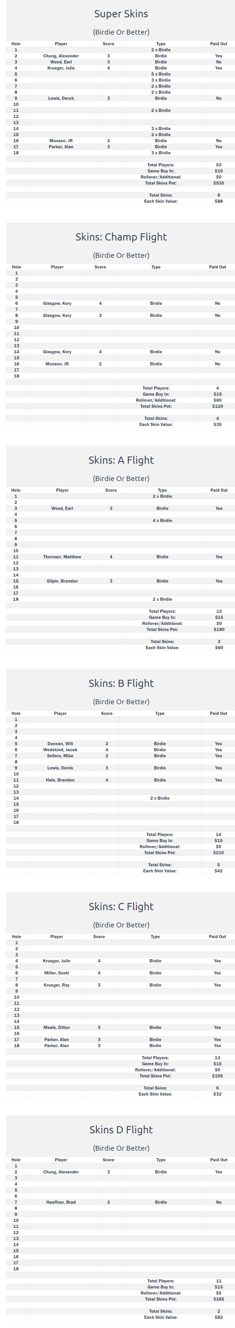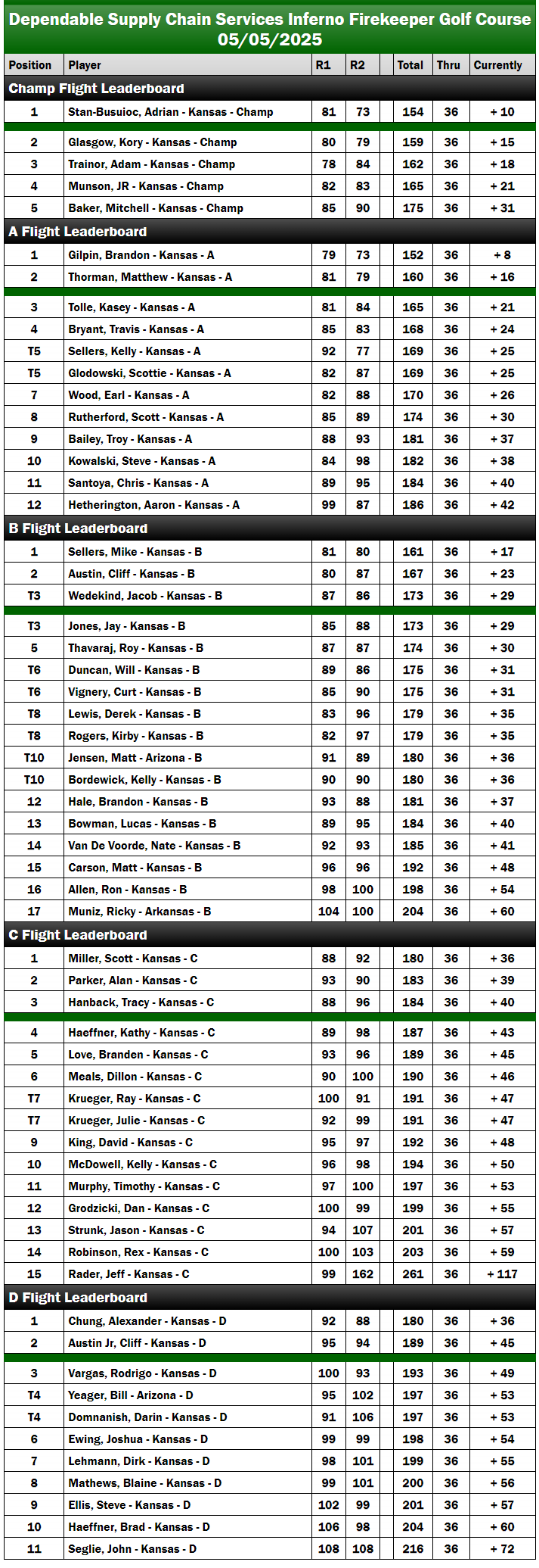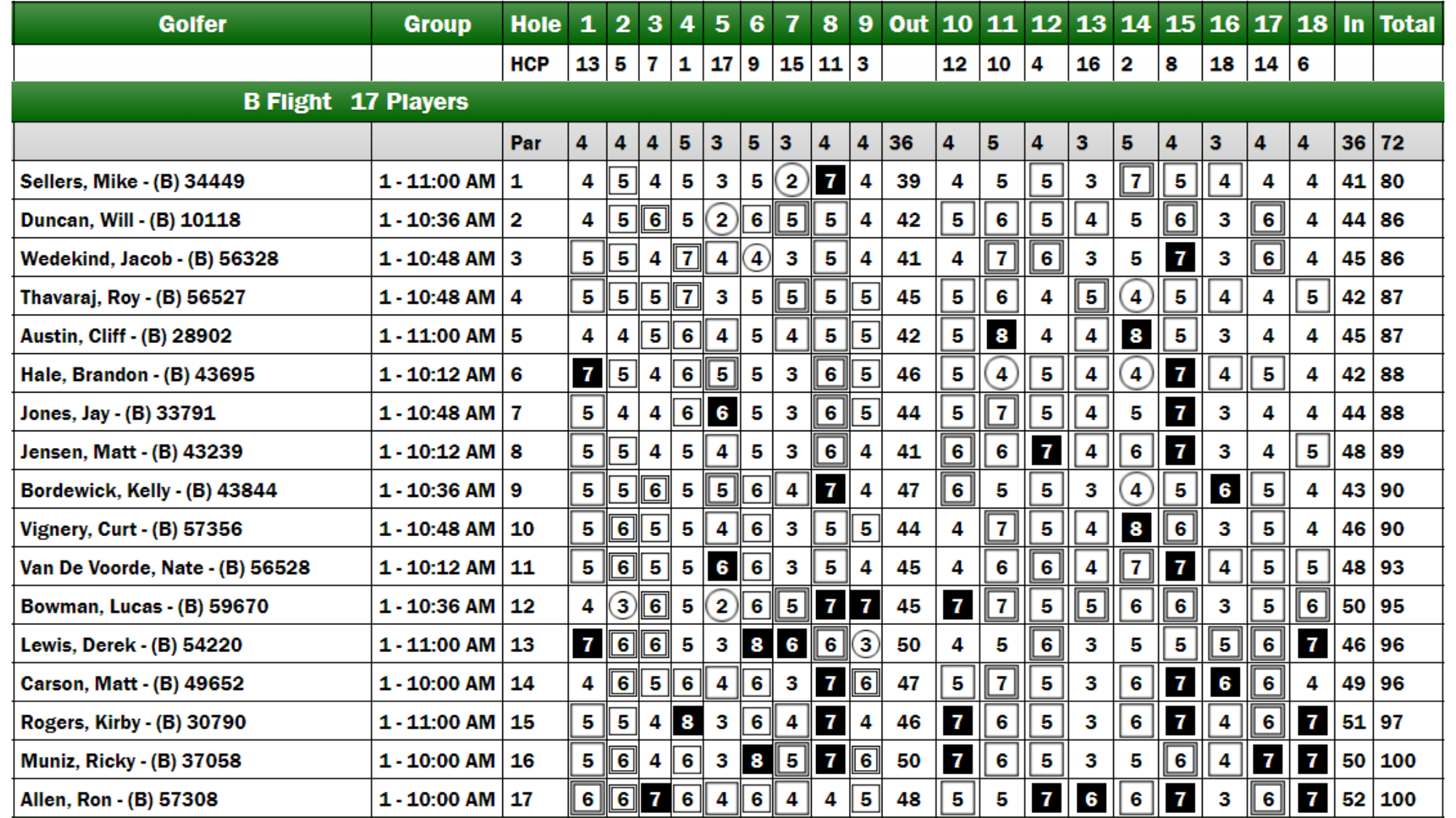 After the conclusion of Day One, the final standings for the B Flight were as follows: Cliff Austin at +8, Mike Sellers at +9, Kirby Rogers at +10, and Derek Lewis at +11. On Day Two, Sellers maintained his strong performance, finishing with a score of +8, which secured him a victory by six strokes over the competition. As a result, Austin earned $330 for his second-place finish, while Jacob Wedekind received $270 for securing third place. Following their performances, both Austin and Sellers have been promoted to the A Flight.