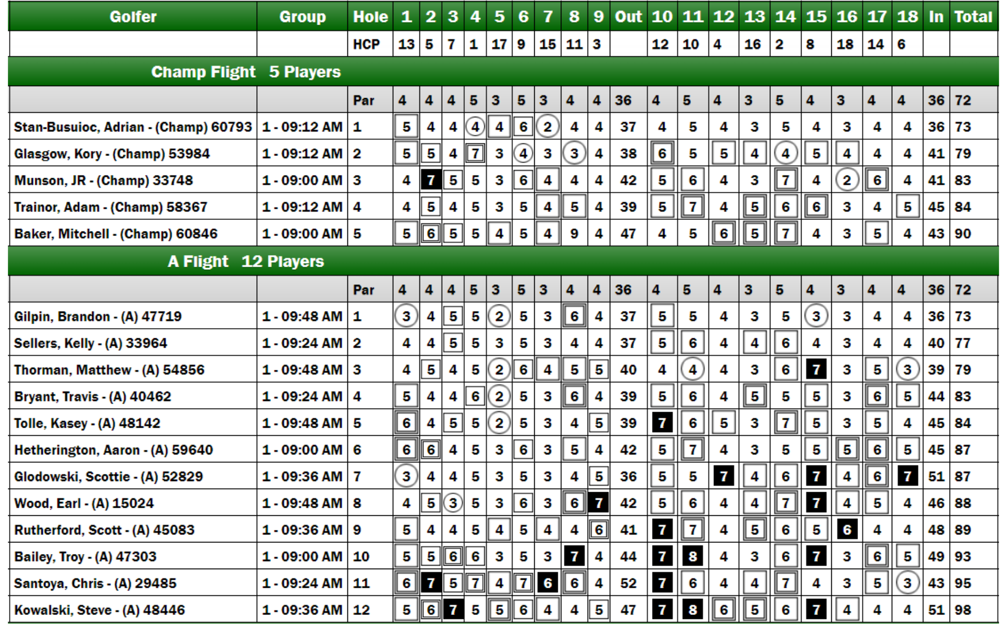 Brandon Gilpin, the 2022 Player of the Year, emerged as the frontrunner after the first day of the A Flight competition, posting a score of +7. Kasey Tolle and Matt Thorman followed closely, trailing by two strokes, while Scott Glodowski and Earl Wood were three shots off the lead.
