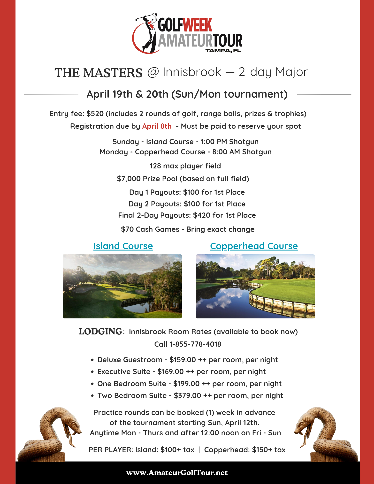 PER PLAYER: Island - $100 plus tax | Copperhead - $150 plus tax